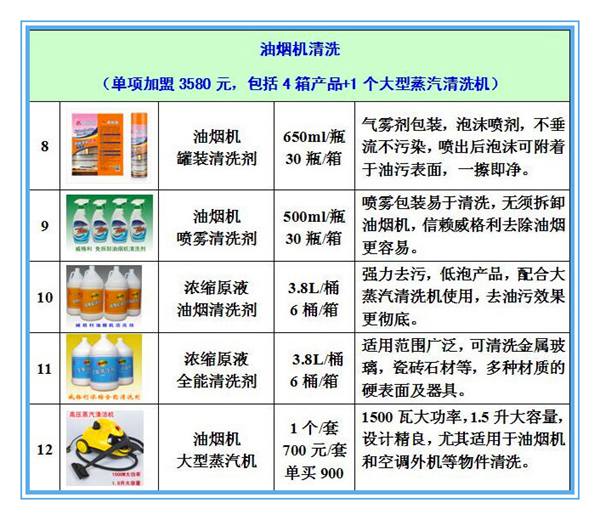 我們洗多多家電清洗加盟中心的門檻很低,沒(méi)有加盟費(fèi),就是產(chǎn)品和工具的費(fèi)用。產(chǎn)品帶工具只要9800元就可以做*各種家電清洗項(xiàng)目。郭*生看到了我們還有3580元的油煙機(jī)單項(xiàng)的配置,就問(wèn)我們這些配置方案之間有什么區(qū)別。于是我們列出來(lái)下面*常用的三種配置方案供他選擇。