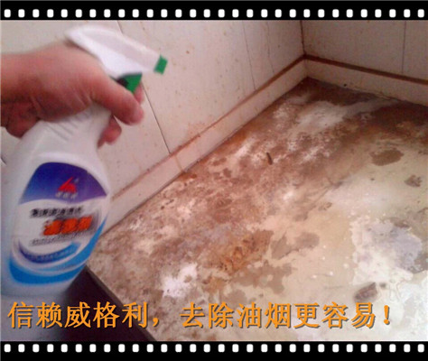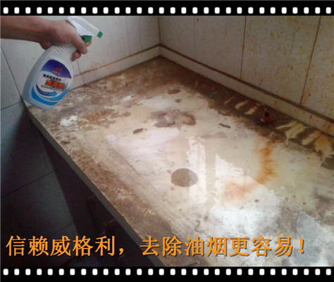 4、油污很快被分解,噴灑的地方都會形成黃黃的油漬,原來沉積在灶臺上的陳年油垢都很快的分解成液體狀的黃色油漬液體。