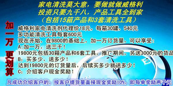 洗多多家電清洗招商加盟中心推出的有家用空調(diào)內(nèi)外機(jī)清洗,車用空調(diào)清洗,油煙機(jī)清洗,飲水機(jī)清洗,電腦清洗,太陽能清洗,洗衣機(jī)清洗,冰箱清洗,中央空調(diào)清洗,各種家電清洗等清洗項(xiàng)目20多個(gè)。這些品類都是投資少,賺錢快,低風(fēng)險(xiǎn)高收益的特別適合創(chuàng)業(yè)的好項(xiàng)目。、家電清洗加盟廠家,家電清洗設(shè)備生產(chǎn)廠家,家電清洗劑,家電清洗設(shè)備