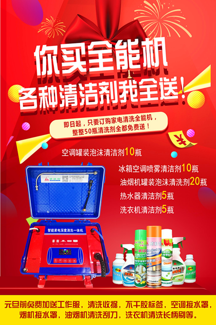 這臺多功能家電清洗機現(xiàn)在開始*費贈送清洗劑啦!除此之外,到公司考察簽約培訓(xùn)的客戶,還報銷往返的火車臥鋪另外500元的食宿補助,各種宣傳彩頁條幅大海報工作服宣傳帳篷等等也都是*費贈送