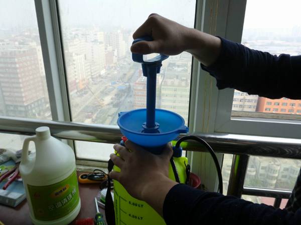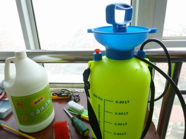 我們知道,空調(diào)室外機(jī)一般安裝位置距窗外不遠(yuǎn),在清洗的時(shí)候需要用一個(gè)類(lèi)似打農(nóng)藥用的噴霧器,里面裝上清洗劑,然后手動(dòng)加壓,直接噴撒即可。一般的噴霧器加上噴霧桿,長(zhǎng)度都在2米以上,因此人站在室內(nèi)就可以直接進(jìn)行室外機(jī)清洗.這和高度沒(méi)有關(guān)系,操作人員根本無(wú)須高空作業(yè).清洗起來(lái)也很容易。我們配送的清洗工具里面有專(zhuān)業(yè)針對(duì)外機(jī)清洗的。