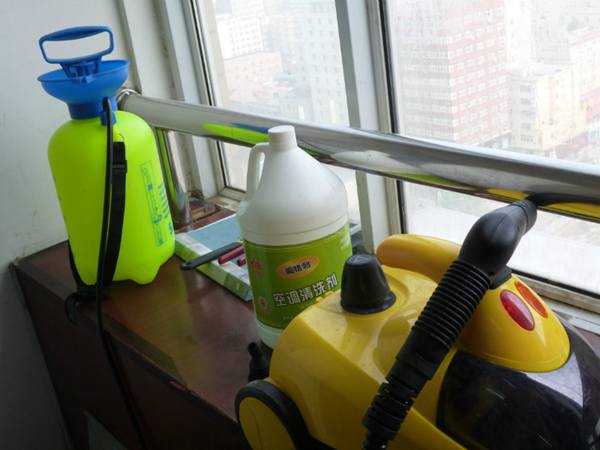 如圖所示,為清洗所用到的工具和產(chǎn)品,就是洗多多的桶裝濃縮清洗劑和噴霧器,選配工具就是輪式1500瓦大功*蒸汽清洗機(jī)。操作時(shí)間,根據(jù)空調(diào)的臟污程度和自己的熟練程度,一般大約在10-15分鐘。
